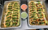 20 Tacos, served with onions, cilantro, limes green and red salsa. Guacamole & chips and salsa.