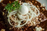 Traditional dish from puebla, topped with grandma Jobita’s homemade mole, onions, queso fresco and sour cream, served with rice.